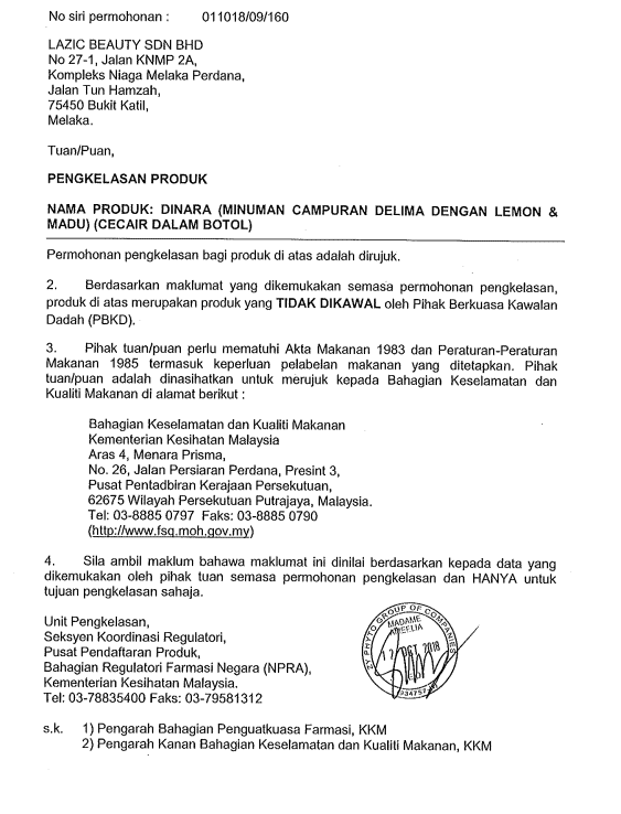 Dinara ini dirumus khas dengan bahan semulajadi dan tak de langsung bahan kimia yang terlarang. Dijamin selamat dengan Kelulusan KKM. Alhamdullilah setakat ini memang tak ada feedback negatif dari pelanggan tentang sebarang masalah komplikasi semasa amalkan Dinara.